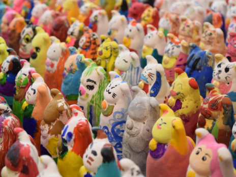 招き猫は、愛らしいポーズで福を招いてくれる日本独自の縁起物。江戸時代に江戸の町人文化から誕生したといわれており、その人気は全国へと広がっていった。上げている手の左右によって御利益が違うだけでなく、産地によって素材や猫の表情も異なります。招き猫美術館の招き猫は800点を超える全国屈指のコレクションです。